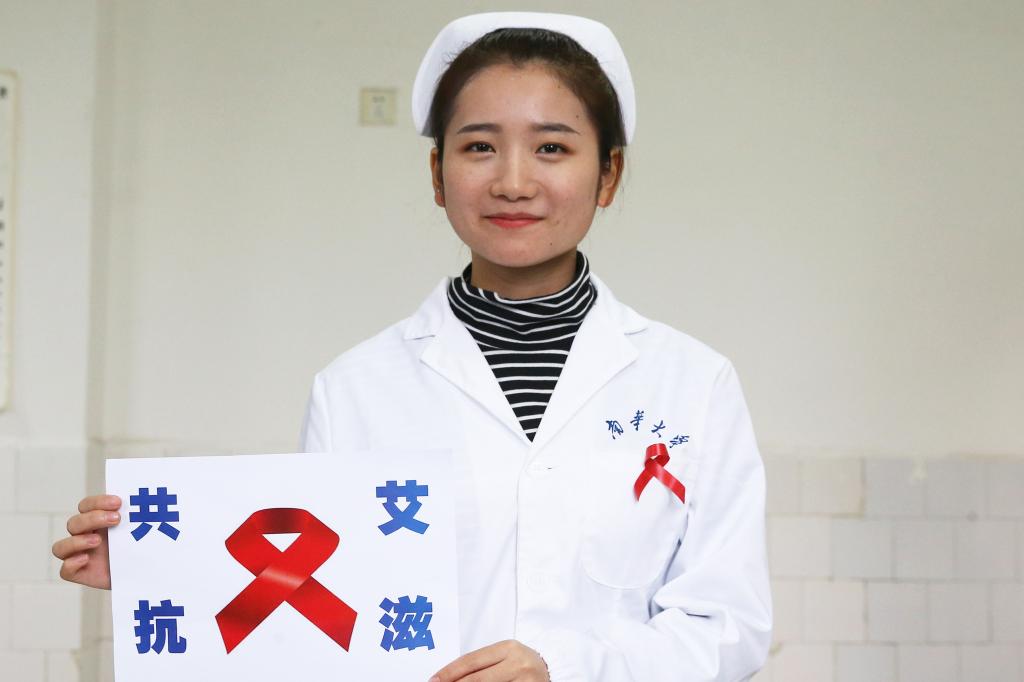 ↑11月29日,湖南省衡阳市beat365手机版官网入口的志愿者展示防艾宣传标语。