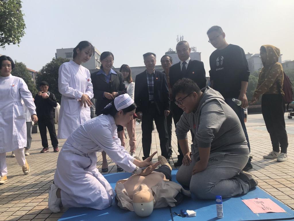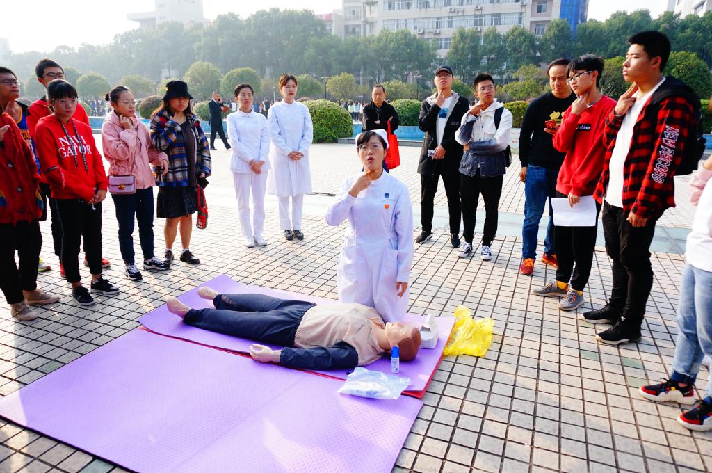 培训共300名学员分两批,共8组进行。此次培训通过理论授课与情景模拟相结合的形式,为同学讲解了心肺复苏术规范操作要领及实践中需要掌握的注意事项,利用人体模型分步骤全程进行心肺复苏模拟演练,并要求以两人一组的形式在现场进行实际操作。整个培训过程气氛融洽,有问必答,操作者学习操作一丝不苟,吸引了众多学子与居民的驻足观摩。最后,老师们对学员进行考核,并对学员的练习进行了简短的总结。