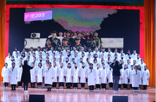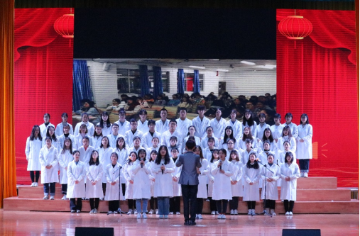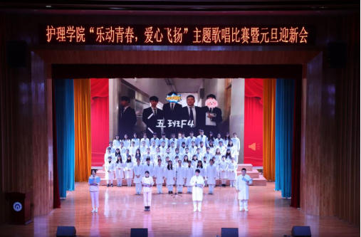 迎新会在活力四射的爵士舞中拉开序幕。院歌《爱心飞扬》为合唱比赛曲目,比赛分两轮进行,上半轮由2018级5-8班、2020级5-8班和2019级5-9班依次演唱。经过中场轻松愉悦的小游戏环节后,现场气氛逐渐活跃。随后,2018级1-4班,2020级1-4班,2019级1-4依次进行下半轮演唱,抑扬顿挫的歌声牵动着现场评委与观众的心,赢得了大家的阵阵掌声。合唱结束后,蒋穗斌老师为现场师生献唱《可可托海的牧羊人》,台下同学们纷纷挥舞手机灯光,积极互动,将现场氛围推向高潮。