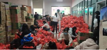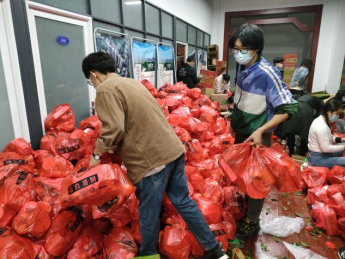 由于同学们踊跃报名,场地受限,院团委、员工会组织140余名志愿者分三批投入战斗。在公司老师及相关负责人的带领下,分组进行分装物资。3桶泡面、1袋面包、1盒饼干、3盒牛奶、2个苹果和2个橘子,依次装进打包袋里,有条不紊,效率极高。