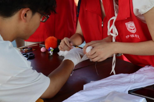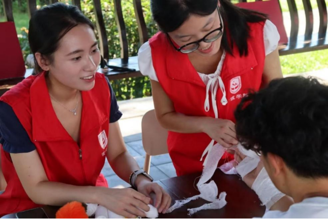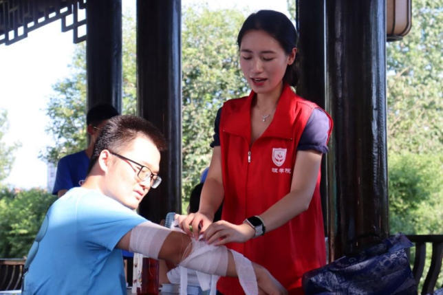 在景区内,志愿服务团队采用“健康知识宣教+急救技能演练+互动答疑”的形式,通过摆摊设点、知识问答等为当地居民和游客普及防溺水急救知识、高温天气防中暑知识、防“三高”的健康知识以及毒蛇蚊虫叮咬应急处理方法,现场演示心肺复苏术、止血包扎法,并发放健康教育宣传手册百余份,有效提升了景区游客和周边居民的夏季健康风险防范意识与自救能力,以专业力量助力健康社区建设,彰显了新时代南华护理学子的社会责任与担当。