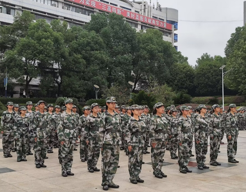 “稍息!立正!”清晨的南华广场上,教官的指令清晰有力。尽管连日阴雨让训练场地带着几分湿冷,新生们的队列依旧如标尺丈量般整齐——抬手、摆臂、踢腿,每一个动作都凝聚着十几天的反复打磨,迷彩服衣袖相互摩擦的“沙沙”声,成了训练场最有节奏的背景音。从最初的动作生疏到如今的整齐划一,汗水浸透的迷彩服、磨出薄茧的手掌,都是他们向“合格军人”标准靠近的见证。