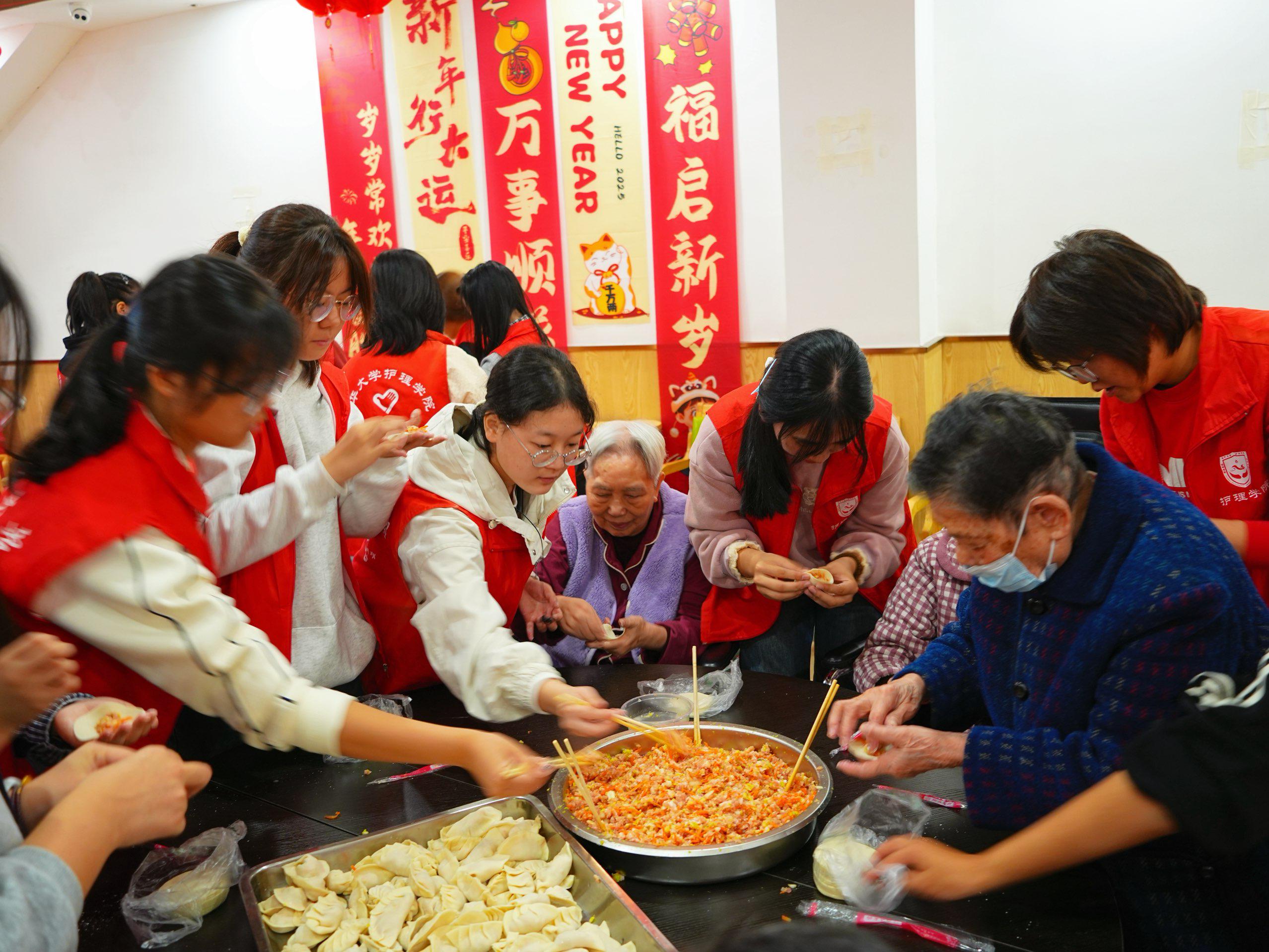 宣讲结束后,一场热闹的“包饺子暖心活动”拉开帷幕。志愿者们围在老人身边,一边虚心请教包饺子的技巧,一边与老人分享生活中的趣事。有的老人手法娴熟,很快就包出了形态饱满的饺子;有的志愿者虽然是初次尝试,但在老人的耐心指导下,也逐渐掌握了要领。小小的活动室里弥漫着饺子的清香与浓浓的温情,老人们的脸上也洋溢着幸福的笑容。