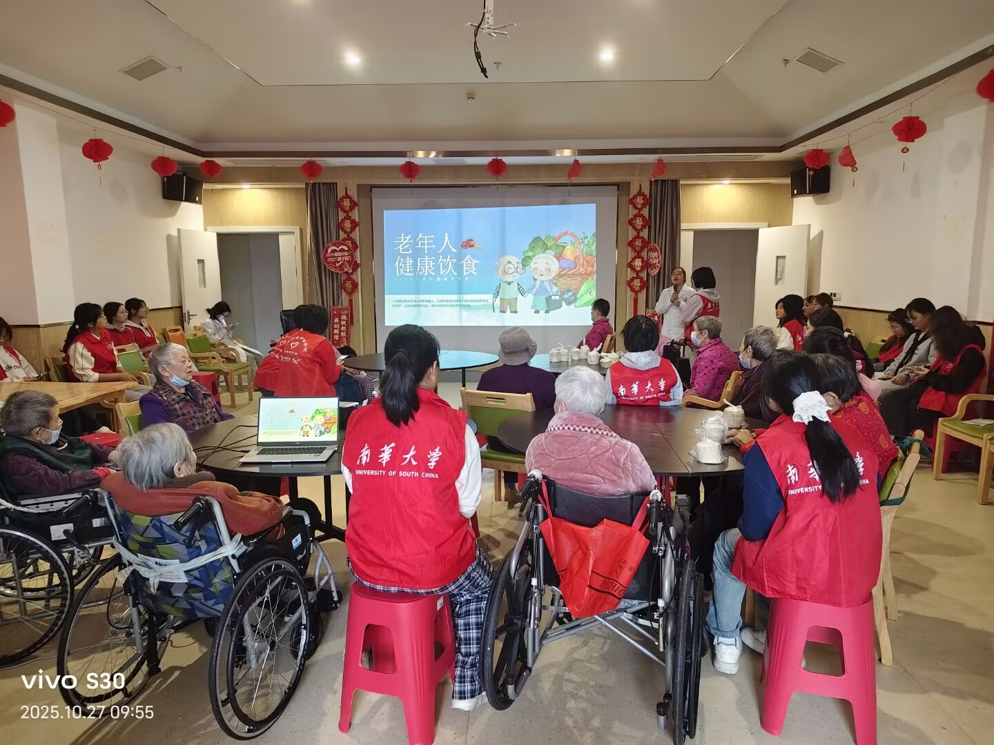 活动现场,志愿者们与老人们围坐在一起,拉起家常、倾听心声。“奶奶,最近天气转凉,您可要记得及时添件厚衣服”“爷爷,您平时喜欢散步吗?适当活动对身体特别好”…… 一句句关切的叮嘱、一次次耐心的倾听,志愿者们迅速拉近了与老人的距离,温馨的氛围在房间内静静流淌。考虑到老年人对健康饮食知识的迫切需求,志愿者们还精心策划了“老年人健康饮食宣讲”环节。他们提前准备了图文并茂的宣传资料,结合老年人的生理特点与饮食需求,用通俗易懂的语言讲解了合理搭配膳食、控制油盐摄入、预防常见饮食相关疾病等知识,让老人们在轻松的氛围中掌握实用的健康技能。
