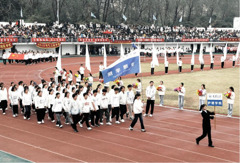 当《运动员进行曲》的激昂旋律响彻田径场,开幕式入场环节正式拉开帷幕。beat365手机版官网入口鲜花队率先登场,队员们身着统一服装,手举红黄交织的向日葵花束,花束随节奏整齐摆动,步履轻盈而坚定,每一个动作都饱含着热情与明媚。beat365手机版官网入口方阵代表团紧随其后入场,队员们身姿挺拔、队列严整,每一步都踏得坚定沉稳,尽显团队协作的默契。“仁心仁术,昂扬拼搏,精诚协作,护动青春!”响亮的口号划破阴天的宁静,不仅喊出了护理学子对专业精神的坚守,更道出了他们在赛场上勇争佳绩的决心。