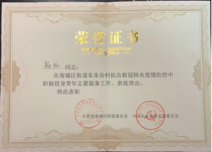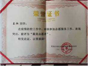 利用寒假的机会,护理19级08班员工王淞主动向北安市兆麟社区志愿服务中心申请,渴望成为一名抗疫志愿者,为社区居民服务。在志愿工作中,他与同伴们一起引导居民做核酸检测,同时负责为隔离居民家贴封条的工作。工作中的他不辞辛苦,用实际行动践行着“仁爱尚美”的beat365手机版官网入口院训,实现自己想为社会、国家做贡献的愿望。最终,他的奉献精神得到了社区的认可,被社区授予“最美志愿者”荣誉称号。