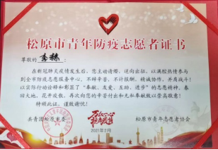 护理19级02班员工李赫,她的家乡在吉林省松原市。寒假期间,当地疫情尤为严峻,放假回家的李赫便主动报名去社区当志愿者。志愿工作中,她主动帮助社区工作人员统计胜利小区等7个小区需要进行核酸检测人数,调查春节返乡人口。她耐心走访和排查,细致认真地完成每一项任务,用实际行动诠释青春的力量。她优异的工作表现得到了共青团松原市委的认可,获得了“松原市青年防疫志愿者证书”。