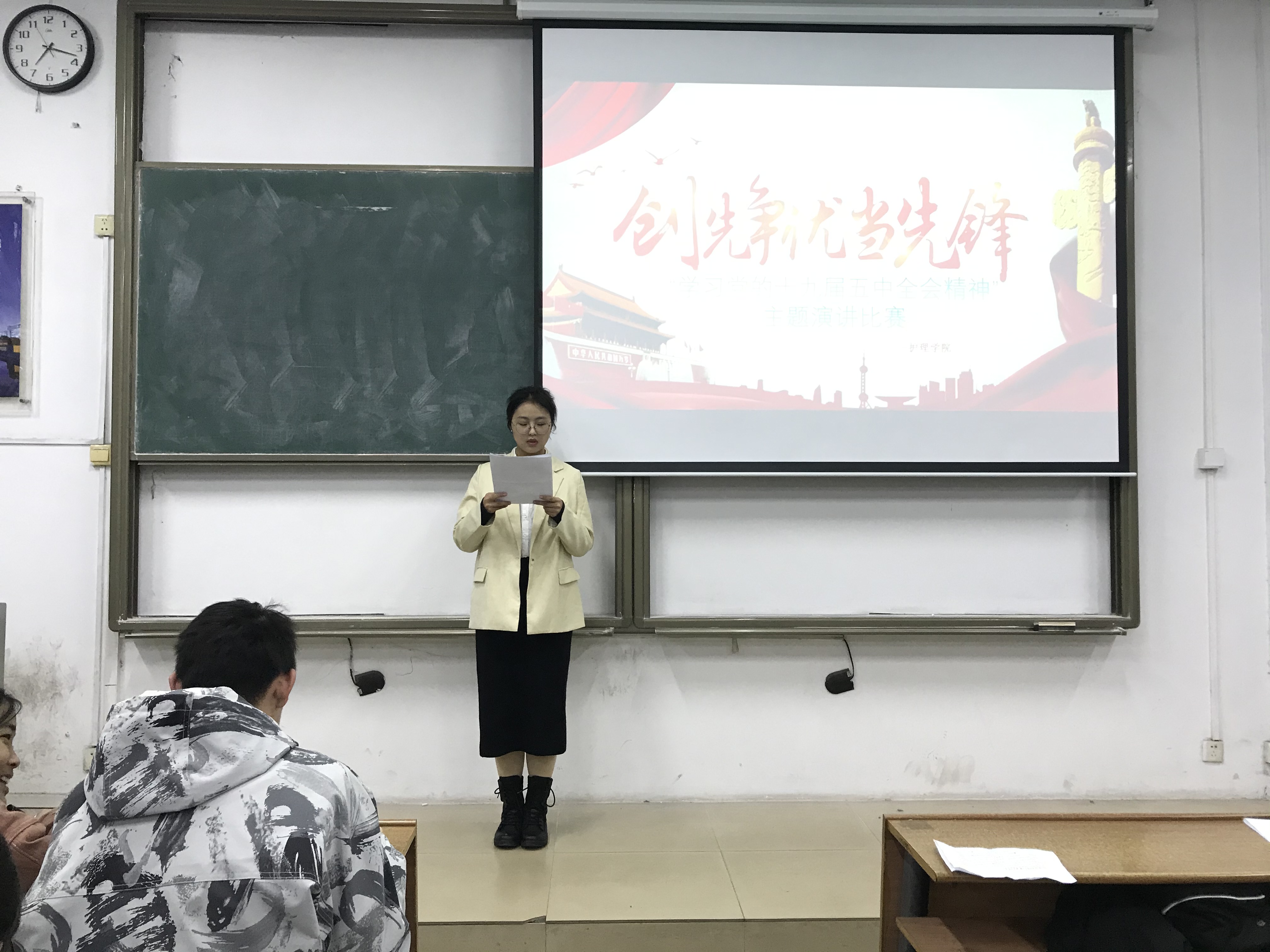 比赛期间,参赛选手们根据抽签顺序依次进行演讲。选手们从老员工视角思考十九届五中全会精神,结合个人生活分享自身的感受,抒发自己独到的见解,论说当代青年学子的责任与担当。选手们精彩的演讲,使得现场气氛十分热烈。观众们听得聚精会神,教室里掌声不断。