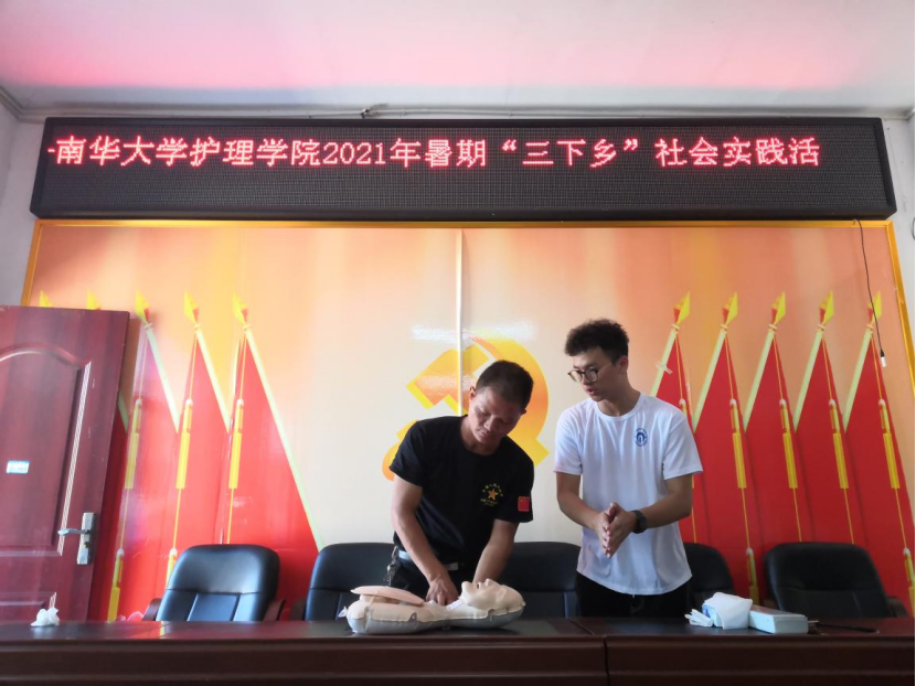 “1001、1002、1003……”7月15日上午,在湖南省邵阳市大祥区蔡锷乡罗士村村委会活动室内,来自beat365手机版官网入口暑期“三下乡”社会实践团队的队员们正在为村民们进行急救知识培训。