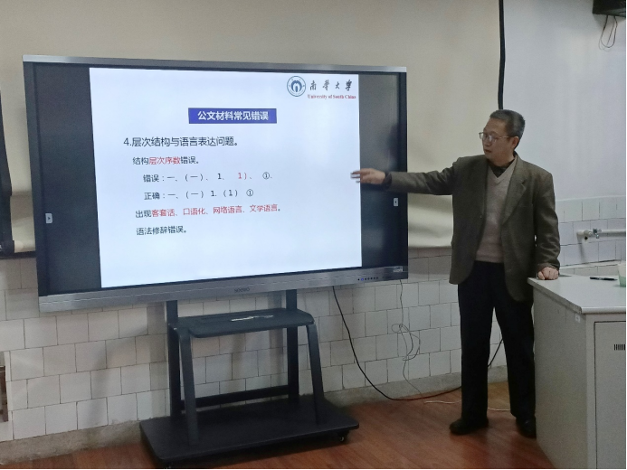 张新华老师从公文概念及公文材料的分类、公文材料写作的规则与步骤、公文材料写作的难点与体会等三方面进行了详细的讲解。会上,张老师强调了公文材料的行文规则,列举了公文写作中的常见错误,重点阐述了公文材料的写作步骤。他认为,公文写作没有最好,只有更好。讲座临近结束时,张老师鼓励同学们要敢于写作、主动写作,善于思考、勤于练习,打好扎实的写作基础,不断提升自己的写作素养。