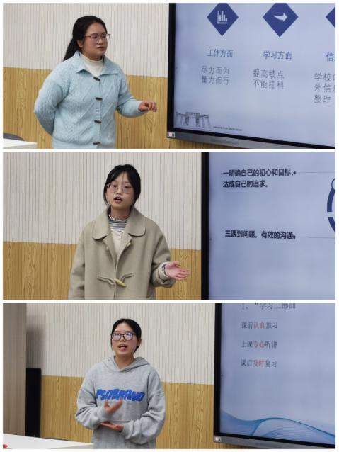 本次报告会邀请了曾荣获国家奖学金、国家励志奖学金、公司奖学金等荣誉的陈慧、魏晨、詹美晨3名同学进行分享,他们结合自身经历,分别从日常学习与工作的时间平衡、研究生推免等方面分享了自己的学习心得、成长经历和感悟建议。护理2001班陈慧首先分享了保研的前期准备、面试要求以及如何提前与导师联系等内容,鼓励学弟学妹们“即使天空有乌云,但乌云缝里的夕阳依然灿烂!”护理2005班魏晨则从校园生活、研究生支教团推免和实习三方面分享了自己的经历,提醒要学会查询资料,提前做好准备,养成主动学习的习惯。护理2102班詹美晨平铺直叙,讲述了护理学专业的学习方法和员工干部工作经验,学会做好学习和员工工作之间的平衡。