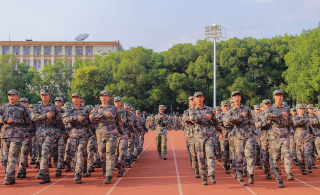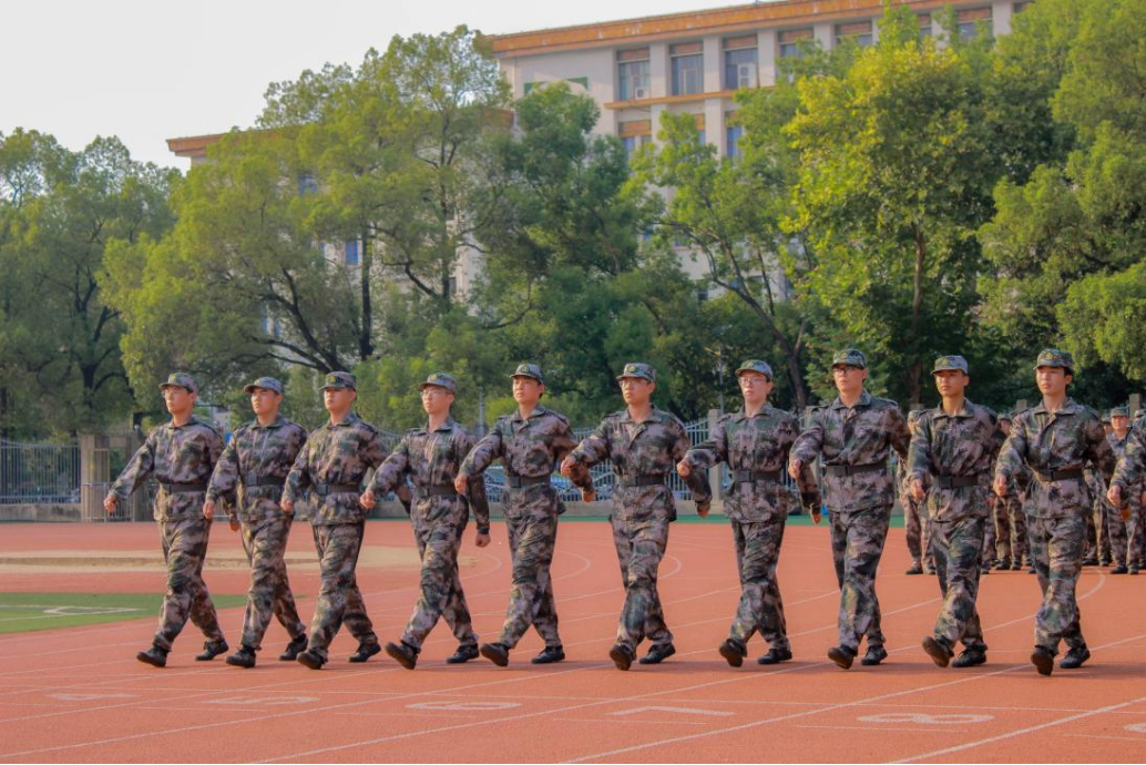 南校足球场上,口号声“一二一、一二一”响彻云霄,同学们与教官同心协力,原地踏步,步伐坚定有力;正步走,目光勇毅向前。帽檐下的汗水,见证了他们拼搏的身影。他们用汗水铸就青春,以橄榄绿为笔,描绘出最美的青春画卷。