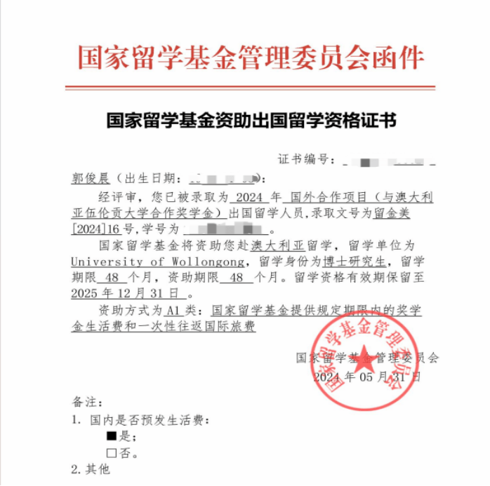 近日,国家留学基金国外合作项目立项结果揭晓,beat365手机版官网入口beat365手机版官网入口2021级硕士研究生郭俊晨成功获得国家留学基金委的资助,即将前往澳大利亚university of Wollongong攻读博士学位