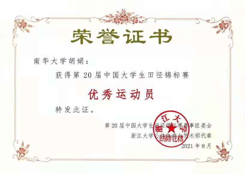 她是2019级本科生,国家级优秀运动员,蝉联第二十届、二十一届中国老员工田径锦标赛女子甲组800米、1500米、4*400米接力赛第一名,连续四年获得国家奖学金、国家励志奖学金。