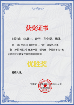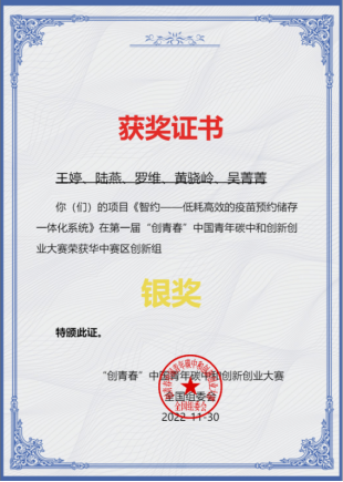 此次大赛,公司学子在华中赛区创新组中获得两个奖项。其中,由公司曾谷清教授、湖南省提灯医疗科技有限公司董事长谭宗威指导,2021级研究生王婷同学为主创的参赛项目《智约一一低耗高效的疫苗预约储存一体化系统》喜获华中赛区创新组银奖;2021级研究生刘彩娟同学作为主创的参赛项目《智护康一“碳”寻绿色足迹智”护数字医疗》获得华中赛区创新组优胜奖。