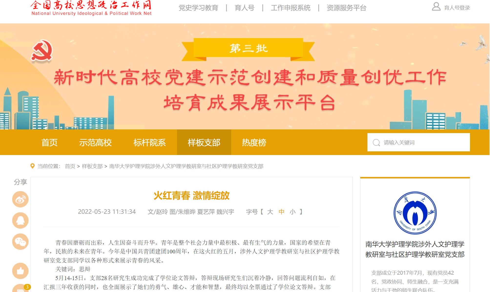上一条:火红青春 激情绽放 --人文与社区护理学教研室师生联合支部员工五月活动综述 下一条:【样板支部】 落实警示教育 加固廉洁防线