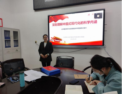 首先,李健芝以“深刻理解中国式现代化的科学内涵”为题,给支部成员上了一堂生动的微党课。她从中国式现代化的基本内涵、中国特色、本质要求、和重大原则四个方面展开讲授,要求全体党员在贯彻学习二十大精神的过程中要紧紧围绕新时代新征程党的中心任务,牢牢把握以中国式现代化全面推进中华民族伟大复兴的使命任务,坚定不移沿着习近平新时代中国特色社会主义思想指引的方向奋勇前进。