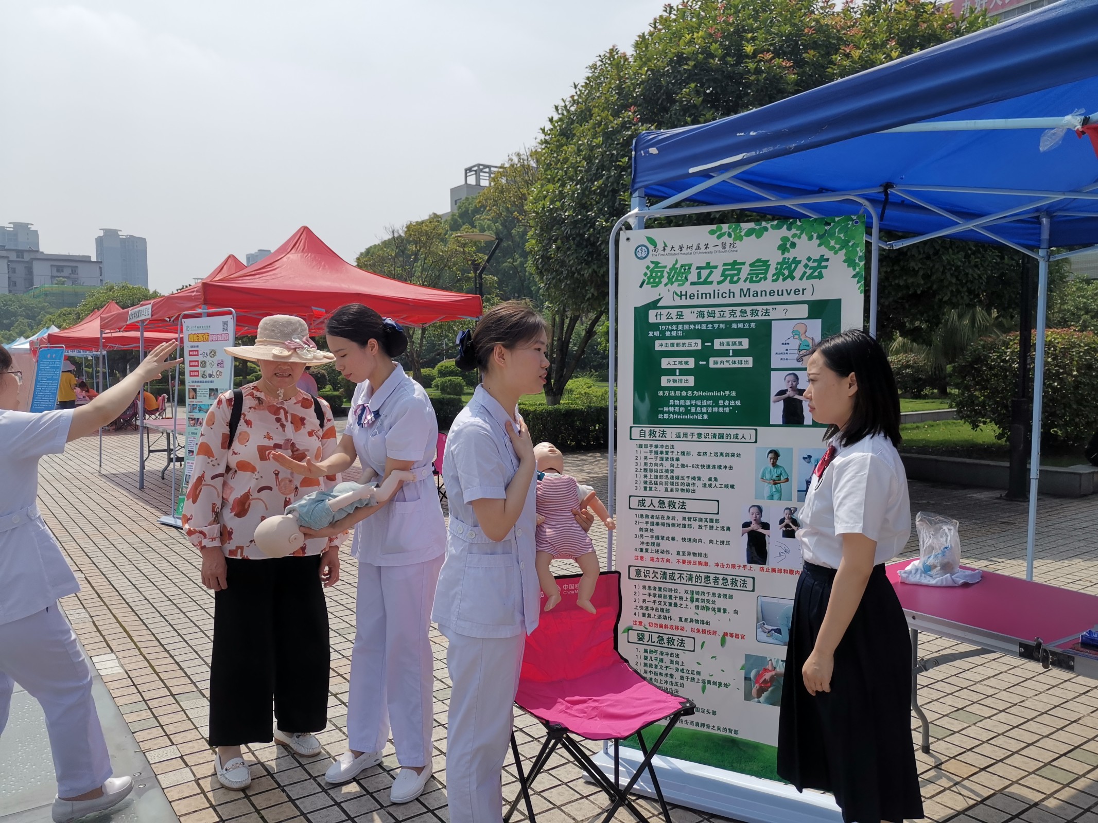烈日当空,宣教人员克服炎热天气影响,耐心认真地为前来咨询的师生和居民解答疑惑。此次健康宣教主要涉及:新冠疫苗主题展览以提高居民对新冠疫苗接种的认知和意愿;气道异物梗阻的急救与预防措施、现场紧急救护心肺复苏术、海姆立克急救法等实用性技能以提高居民紧急情况自救能力;糖尿病、冠心病等慢性病的预防及保健知识以提升居民的健康生活质量。宣教过程中,大家积极实践,在现场宣教老师的悉心指导和教学下,理解并掌握了心肺复苏术等各项技能的实施与操作,现场气氛十分融洽。