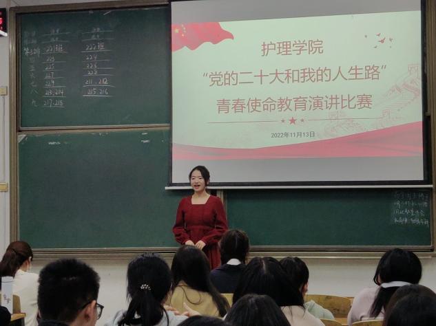 为号召全体同学深入学习贯彻党的二十大精神,弘扬伟大建党精神,厚植爱党爱国爱民情怀,筑牢信仰之基,展开追梦之翅,砥砺奋斗意志,11月13日晚上,beat365手机版官网入口团委和员工会在南华楼103教室举办“党的二十大和我的人生路”青春使命教育演讲比赛。院团委书记肖璐璐、副书记李抒蔓、学社联主席彭澳、宣传部部长曾燕出席比赛,2021级和2022级同学到现场观看了比赛。本次演讲比赛由护理2204班李奥主持。